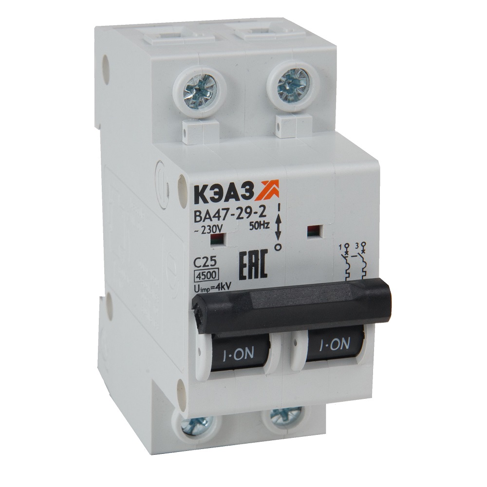 Полные технические характеристики Выключатель автоматический двухполюсный 10А D ВА47-29-2D10-УХЛ3 КЭАЗ 318255