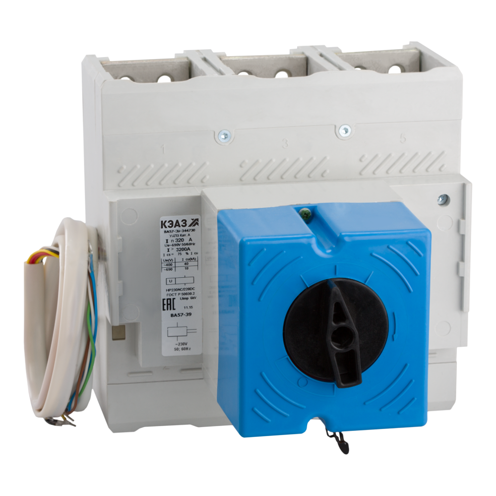 Описание Силовой 3 полюсный автоматический выключатель переменного тока в литом корпусе на номинальный ток 400 А. Трехполюсные автоматические выключатели КЭАЗ типа ВА 57-39 предназначены для применения в электрических цепях с напряжением 400 / 690 В переменного тока частотой 50 и 60 Гц и 440В постоянного тока, их защиты от токов короткого замыкания, токов перегрузки, недопустимых снижений напряжения, а также для нечастых оперативных включений и отключений.