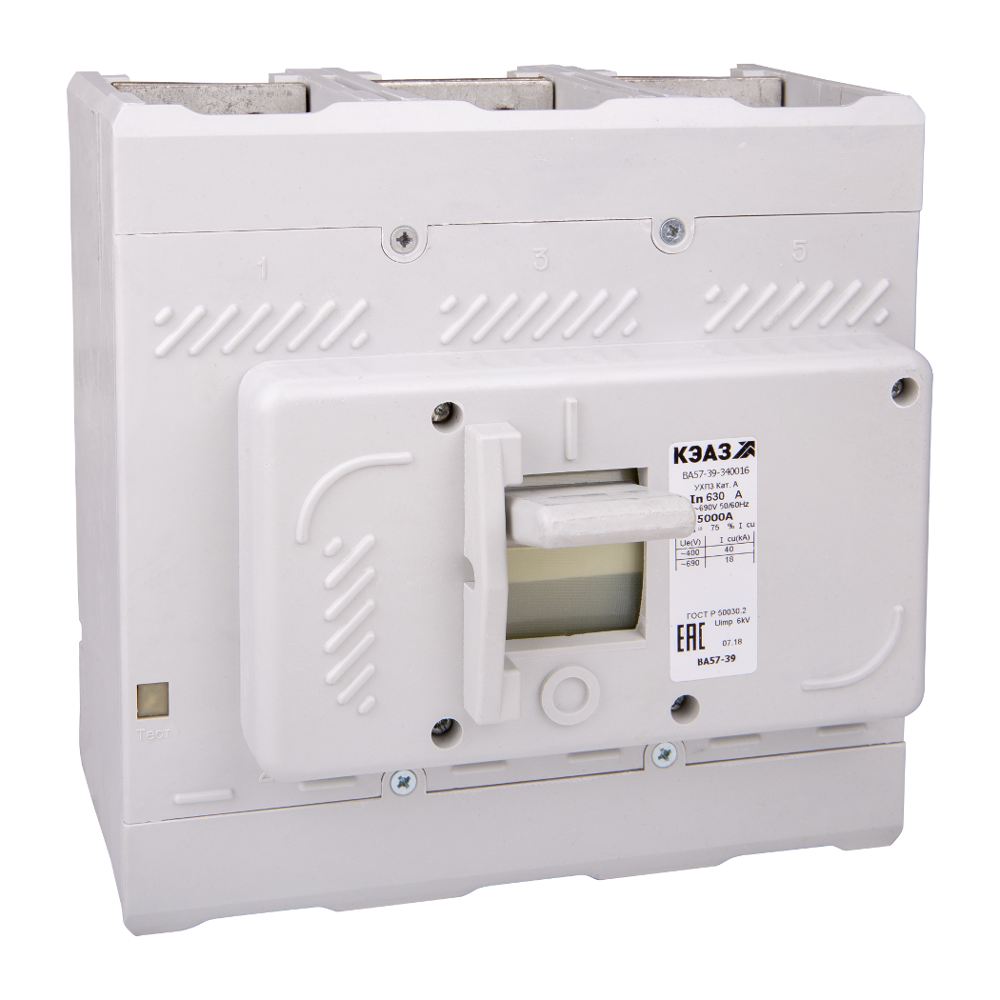 Описание Силовой 3 полюсный автоматический выключатель постоянного тока в литом корпусе на номинальный ток 630 А. Трехполюсные автоматические выключатели КЭАЗ типа ВА 57-39 предназначены для применения в электрических цепях с напряжением 400 / 690 В переменного тока частотой 50 и 60 Гц и 440В постоянного тока, их защиты от токов короткого замыкания, токов перегрузки, недопустимых снижений напряжения, а также для нечастых оперативных включений и отключений.