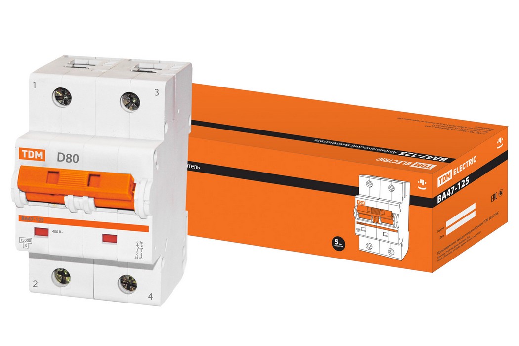 Выключатель автоматический ВА47-125 двухполюсной 80А 15кА характеристика D TDM ELECTRIC SQ0208-0022