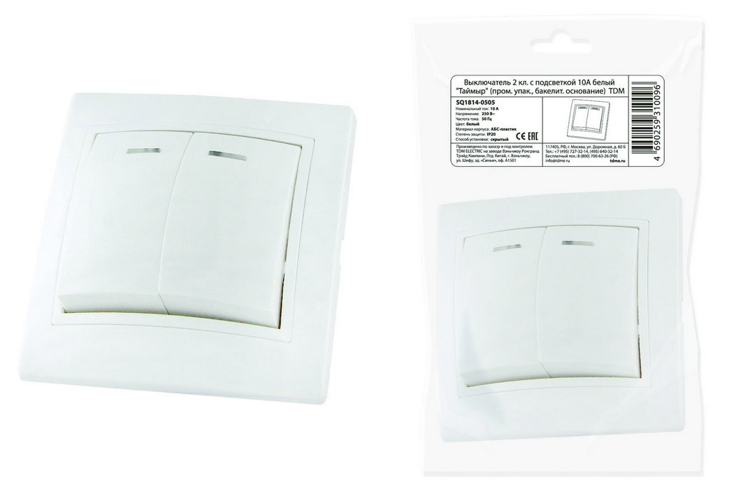 Наименование в каталоге Выключатель двухклавишный с подсветкой 10А белый Таймыр (промышленная упаковка, бакелитовое основание)
