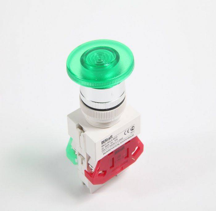 Описание Выключатель кнопочный серии ВК-22 DEKraft, с грибовидным толкателем, зеленый, с неоновой лампой, ном.ток 10 А, установка - на панели или двери, степень защиты - IP54, подключение - винтовыми зажимами. Выключатели кнопочные ВК-22 предназначены для коммутации электрических цепей и индикации состояния электрических цепей. Применяются в сетях переменного тока частотой 50/60 Гц с напряжением до 660В. Могут устанавливаться на подвижных и неподвижных частях стационарных установок.