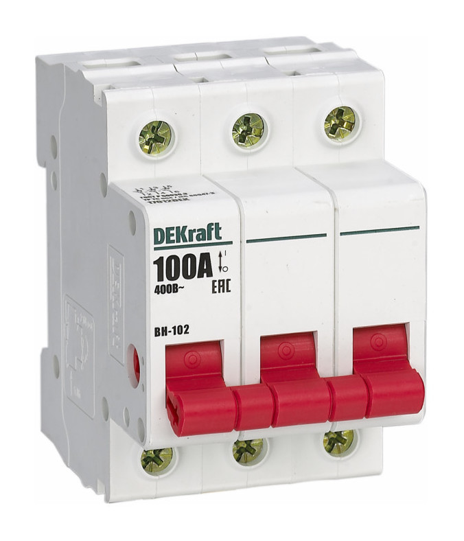 Описание Выключатель-разъединитель серии ВН-102 DEKraft, 3P, номинальный ток 125 А, установка - на DIN-рейку, установочное положение - любое. Выключатели-разъединители применяются для ручного включения/отключения сетей напряжением до 400 В. Специальные мостиковые контакты обеспечивают надежный разрыв цепи, они полностью исключают возможность перекрытия дугой по изоляции. Усиленная рукоятка управления обеспечивает большое количество включений/отключений.