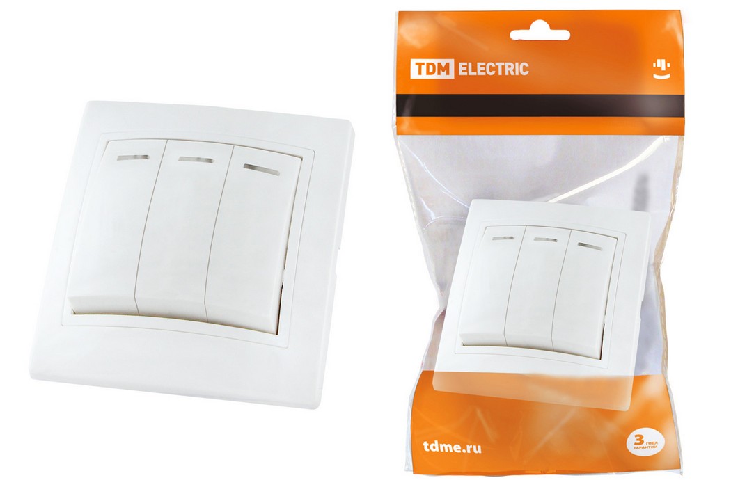 Полные технические характеристики Выключатель трехклавишный с подсветкой 10А белый Таймыр TDM ELECTRIC SQ1814-0006