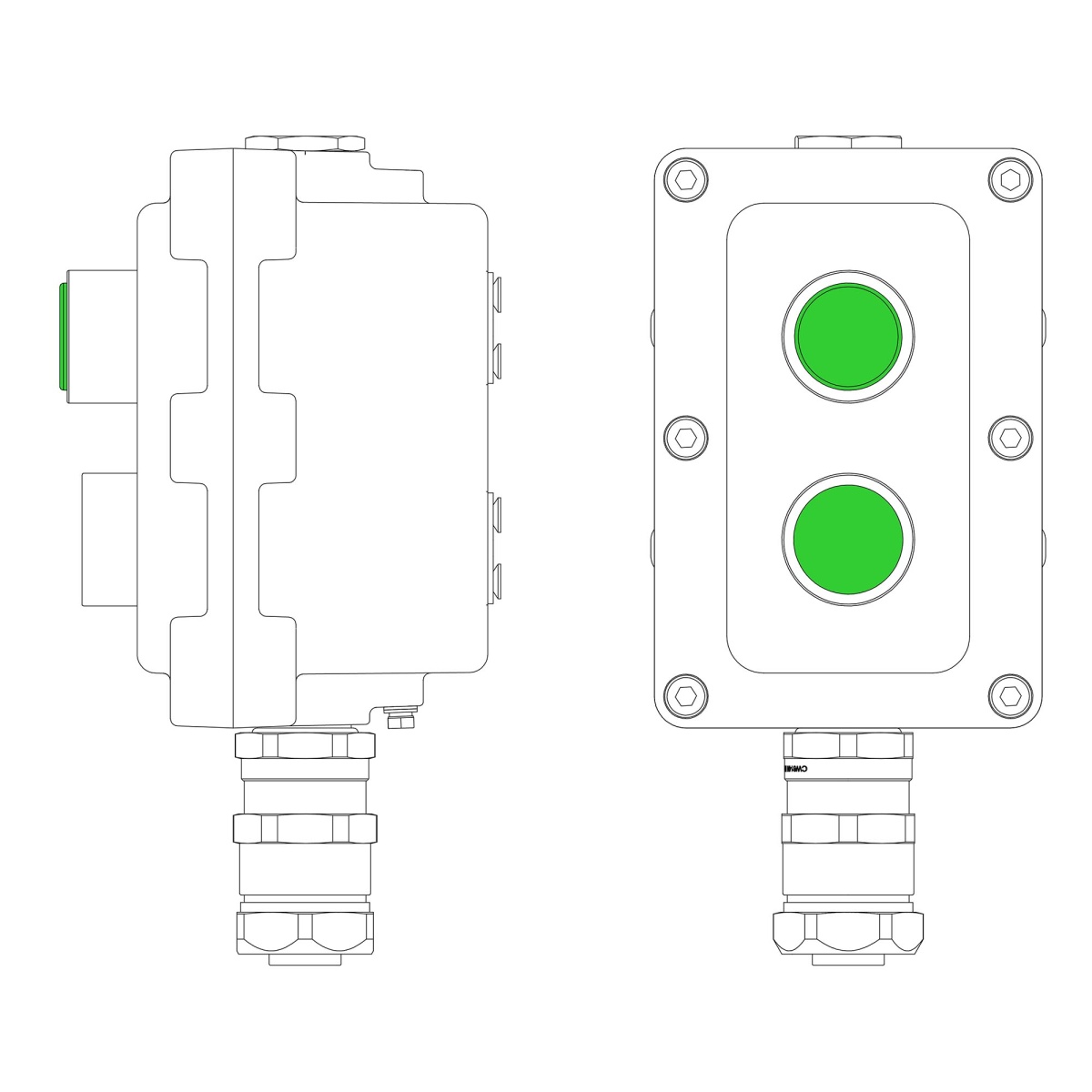 Наименование в каталоге Взрывонепроницаемый пост управления из алюминия LCSD-02-B-MB-L1G(220)x1-P1G(11)x1-PBMB-KAEPM2MHK-20