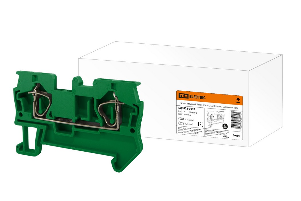 Полные технические характеристики Зажим клеммный безвинтовой (ЗКБ) 2,5 мм2 31А зеленый TDM ELECTRIC SQ0822-0092