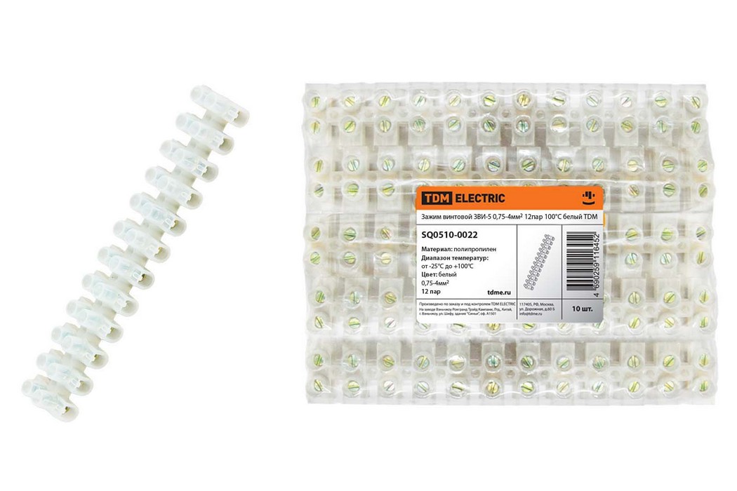 Зажим винтовой ЗВИ-5 полипропилен 0,75-4мм2 12пар 100С белый TDM ELECTRIC SQ0510-0022